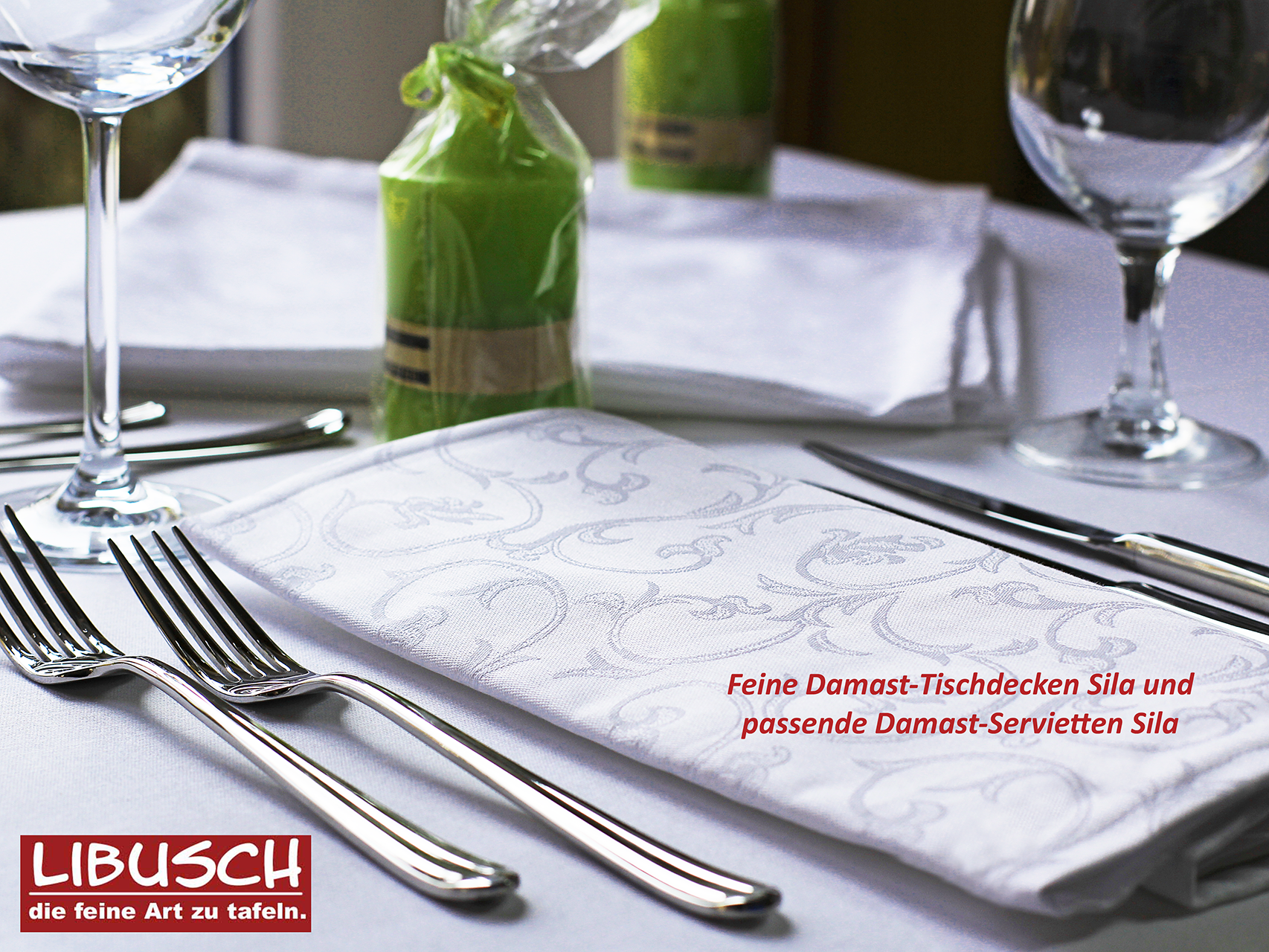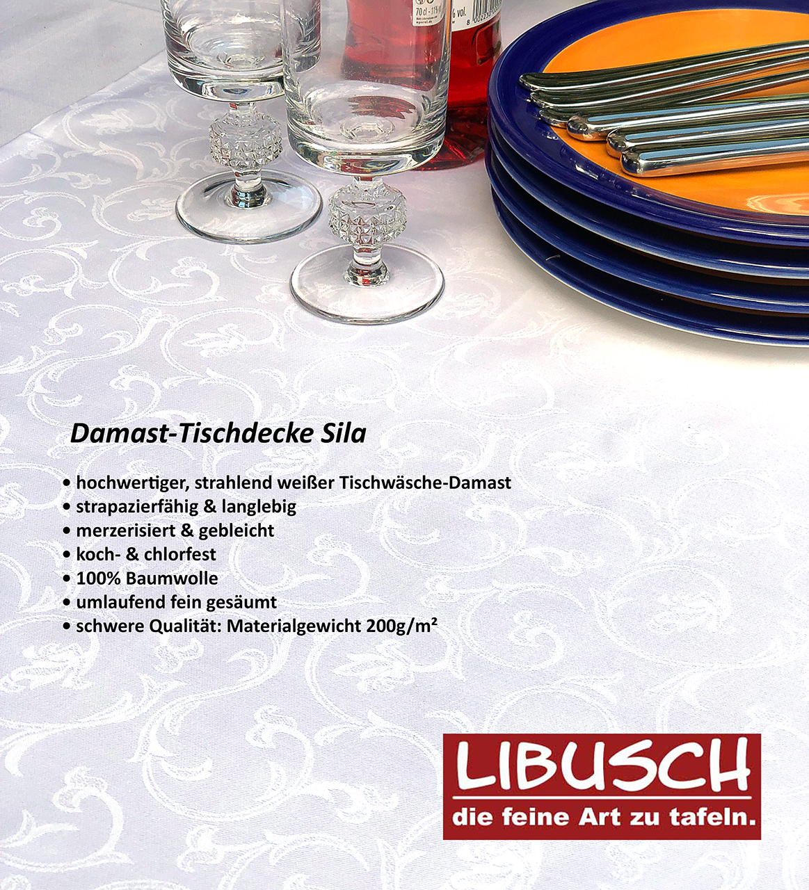 Wir empfehlen die Damast-Tischdecke Sila zu allen schönen Feiern und wichtigen Anlässen. Bestellen Sie gleich passende Damast-Servietten aus unserer Serie Sila mit, dann haben Sie Ihre ganze Tischwäsche im gleichen Design.
