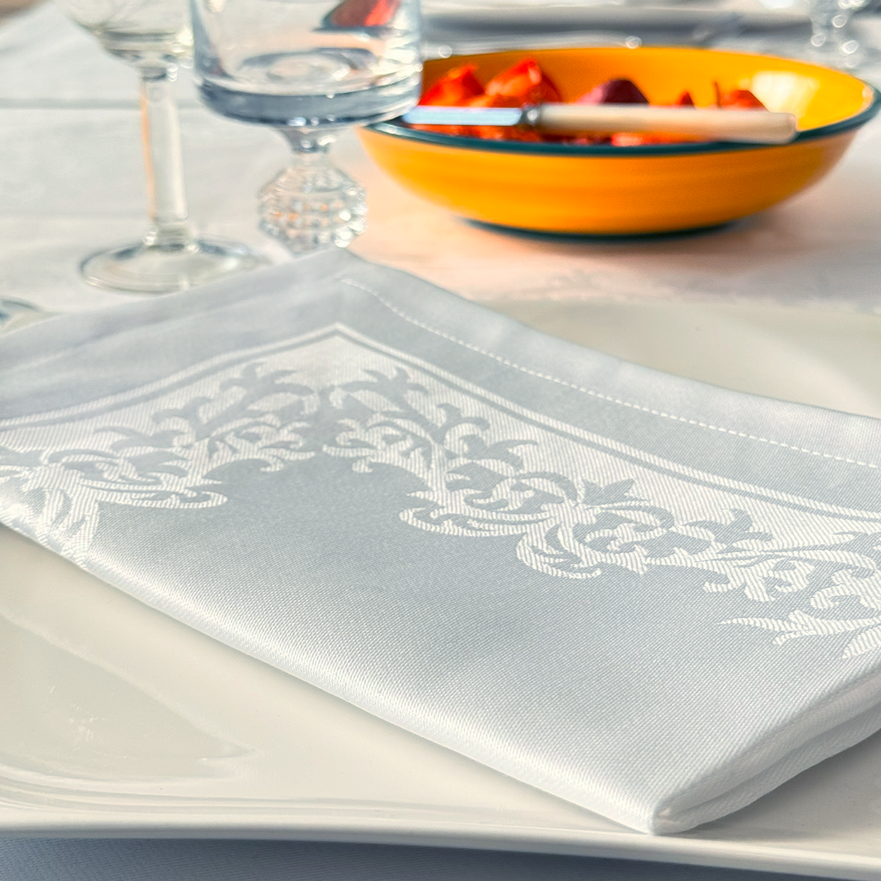 Die Damast-Servietten Prinzipal passen in Stofflickeit und Verarbeitung zu unseren Damast-Tischdecken Prinzipal. Vervollständigen Sie Ihre Tischwäsche.